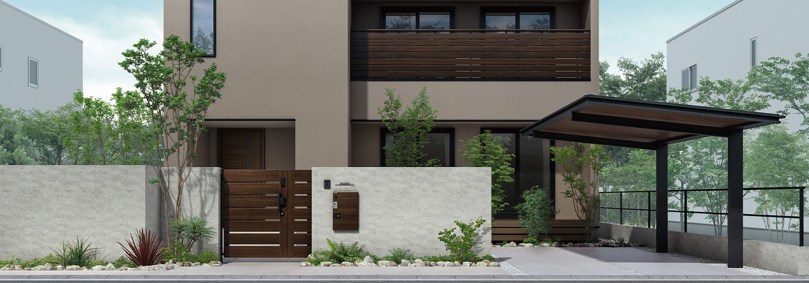 - 外壁や塀、アプローチの素材・色味と門まわりの統一感