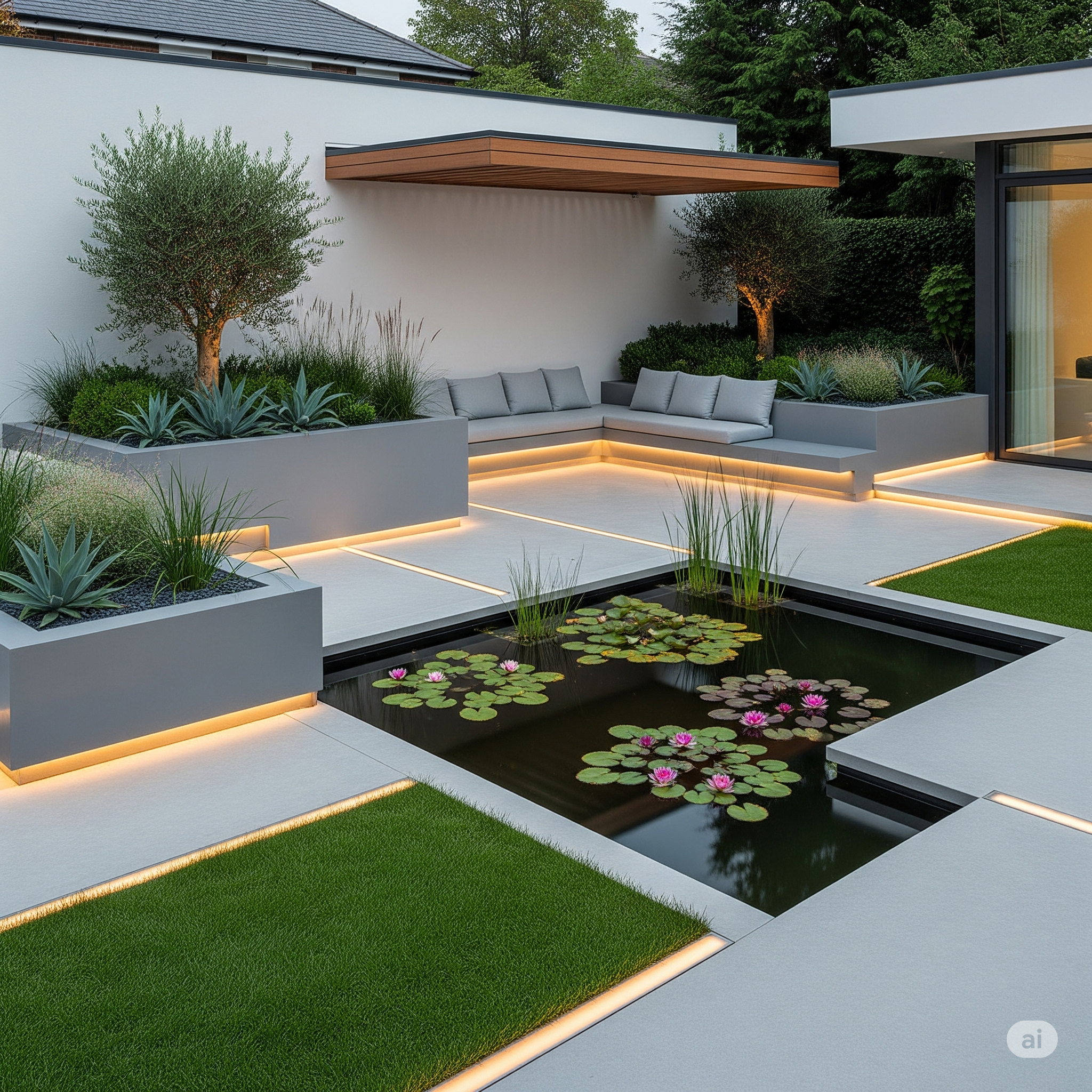 コンクリートやタイル、人工芝を活用し、シンプルで洗練された印象に。夜間は外構照明を組み合わせて、昼夜問わず美しい空間を演出。