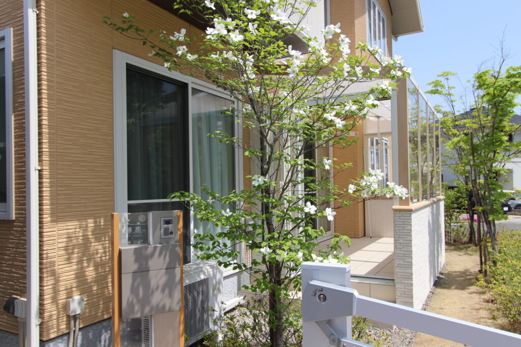 仙台市では、アオダモ、ハナミズキ、ヤマボウシなど季節感のある落葉樹が庭によく合います。腰壁の高さを植栽の高さと調整することで、庭全体に自然な落ち着きが生まれます。