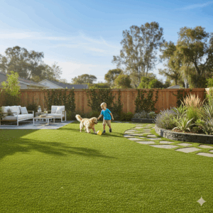 - 芝生やタイルテラスで子どもが遊べる安全な空間