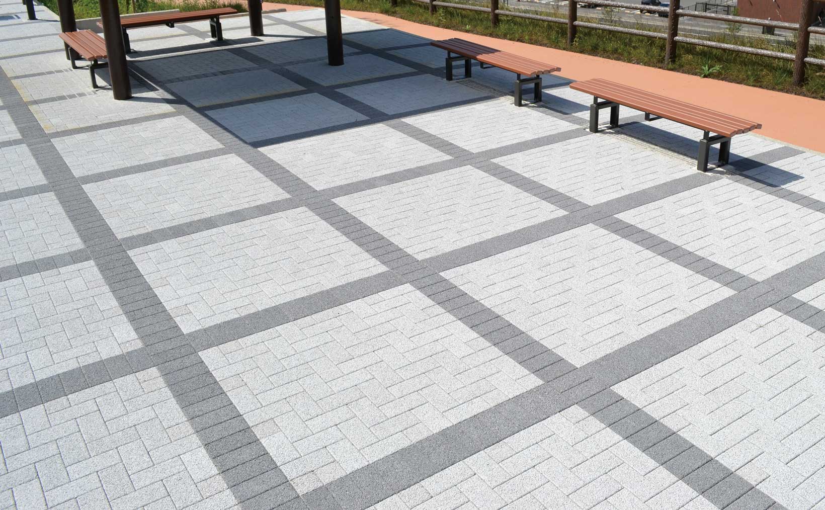 降雨時に水を地中に浸透させる透水性のある舗装です。表面に水が残りにくく、歩行者と環境に優しい敷材です。