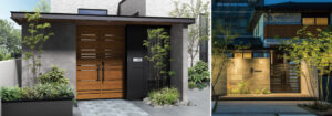 - 太白区の新築住宅では、木調アルミの門柱にポスト・インターホン・照明を一体化し、統一感あるファサードを実現。