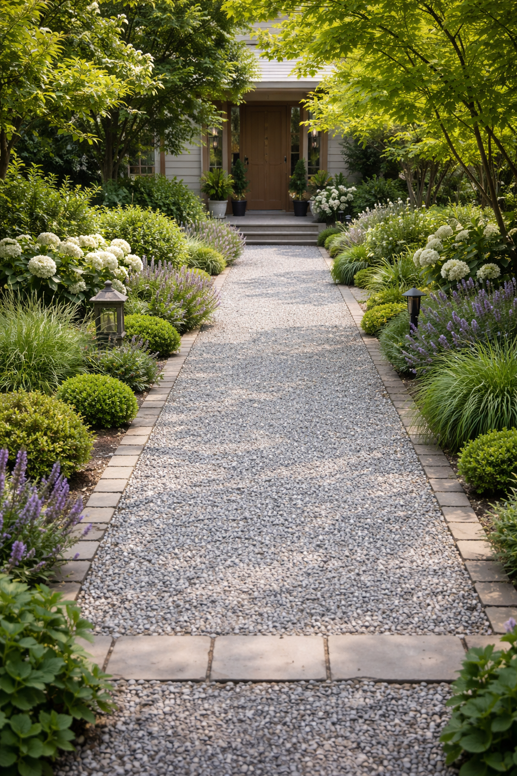 アプローチ横の通路に、丸みのある砂利を使用し歩行しやすい仕上がりに。防草と安全性を両立しつつ、建物との調和をデザインしました。