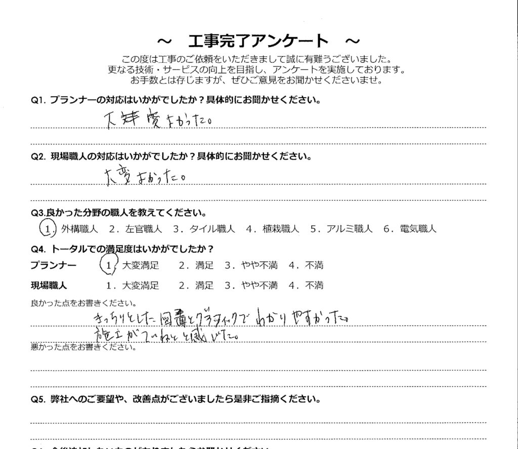 きっちりした図面とグラフィックで分かりやすかった。施工がていねいと感じた。 2025 7/12 2025年7月12日 いろいろ親身に対応をいただいた。暑い中、一生懸命仕事していただいた。 こちらの要望をすぐお見積書にして頂き、図面、3D等とても分かりやすくて良かったです。 関連記事 仙台市 目隠しフェンス グランドアートウォール 樹ら楽ステージ プラスG 富谷市 ガーデンルーム工事 他社ともあいみつさせていただきましたが、もっともていねいにご対応いただきました。 こちらの意向をくみとったプランを提案して頂き、良かったです。ていねいでキレイな施工で満足です。 現場調査、見積や契約内容説明など、すべてにおいて誠実で丁寧な対応で、大いに好感が持てた。 こちらの要望をすぐお見積書にして頂き、図面、3D等とても分かりやすくて良かったです。 いろいろ親身に対応をいただいた。暑い中、一生懸命仕事していただいた。 こちらの要望に沿っての提案やアドバイスがたいへんわかりやすく、納得のいくプランができあがり良かったです。