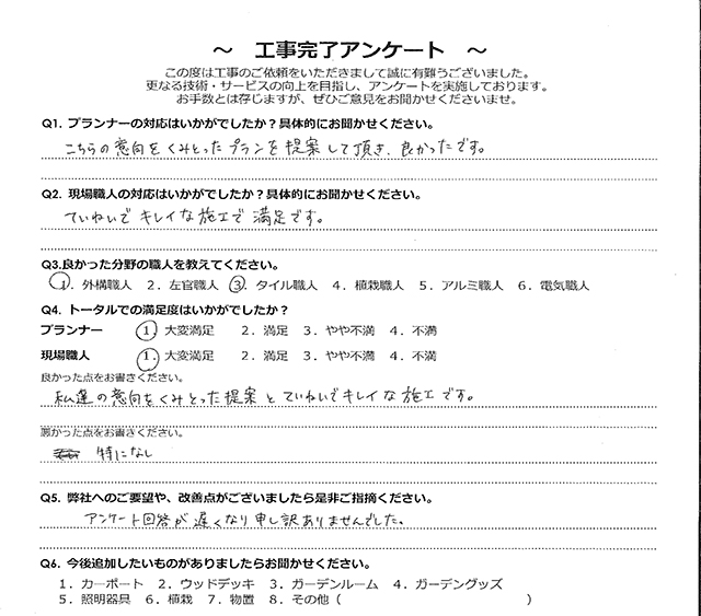 こちらの意向をくみとったプランを提案して頂き、良かったです。ていねいでキレイな施工で満足です。 2025 8/24 2025年7月12日2025年8月24日 現場調査、見積や契約内容説明など、すべてにおいて誠実で丁寧な対応で、大いに好感が持てた。 他社ともあいみつさせていただきましたが、もっともていねいにご対応いただきました。 関連記事 仙台市 目隠しフェンス グランドアートウォール 樹ら楽ステージ プラスG 富谷市 ガーデンルーム工事 他社ともあいみつさせていただきましたが、もっともていねいにご対応いただきました。 現場調査、見積や契約内容説明など、すべてにおいて誠実で丁寧な対応で、大いに好感が持てた。 こちらの要望をすぐお見積書にして頂き、図面、3D等とても分かりやすくて良かったです。 きっちりした図面とグラフィックで分かりやすかった。施工がていねいと感じた。 いろいろ親身に対応をいただいた。暑い中、一生懸命仕事していただいた。 こちらの要望に沿っての提案やアドバイスがたいへんわかりやすく、納得のいくプランができあがり良かったです。