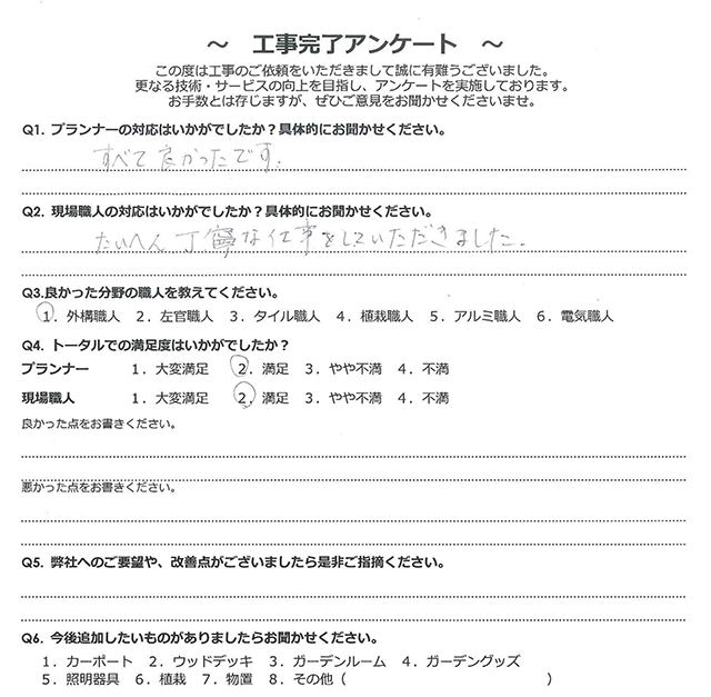 すべて良かったです。たいへん丁寧な仕事をしていただきました。 2025 8/24 2025年7月12日2025年8月24日 時前の準備も良く、わかりやすい説明でプランを作成して頂きました。エクステリアに関しては、次も御社に相談し利用したいと思います。 打ち合わせの度に、細かい要望も聴いて頂き、とても丁寧に対応して頂きました。 関連記事 仙台市 目隠しフェンス グランドアートウォール 樹ら楽ステージ プラスG 富谷市 ガーデンルーム工事 他社ともあいみつさせていただきましたが、もっともていねいにご対応いただきました。 こちらの意向をくみとったプランを提案して頂き、良かったです。ていねいでキレイな施工で満足です。 現場調査、見積や契約内容説明など、すべてにおいて誠実で丁寧な対応で、大いに好感が持てた。 こちらの要望をすぐお見積書にして頂き、図面、3D等とても分かりやすくて良かったです。 きっちりした図面とグラフィックで分かりやすかった。施工がていねいと感じた。 いろいろ親身に対応をいただいた。暑い中、一生懸命仕事していただいた。