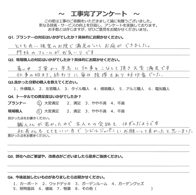 とても良い提案のお陰で満足のいくお庭ができました。社長さんもとてもいい方でシビルジャパンにお願いして良かったと思いました。