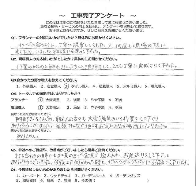 阿部さんをはじめ、職人の方々も大変満足のいく作業をして下さりありがとうございました。家族みんなで過ごすお気に入りの場所になりました。 2025 8/24 2025年7月12日2025年8月24日 人柄の良い社長だからこそ、職人さんも人柄が良く、すばらしかったです。外構のデザインも最高です。 デザインの変更等も心良く対応してくださり、良い外構に仕上がりました。 関連記事 仙台市 目隠しフェンス グランドアートウォール 樹ら楽ステージ プラスG 富谷市 ガーデンルーム工事 他社ともあいみつさせていただきましたが、もっともていねいにご対応いただきました。 こちらの意向をくみとったプランを提案して頂き、良かったです。ていねいでキレイな施工で満足です。 現場調査、見積や契約内容説明など、すべてにおいて誠実で丁寧な対応で、大いに好感が持てた。 こちらの要望をすぐお見積書にして頂き、図面、3D等とても分かりやすくて良かったです。 きっちりした図面とグラフィックで分かりやすかった。施工がていねいと感じた。 いろいろ親身に対応をいただいた。暑い中、一生懸命仕事していただいた。