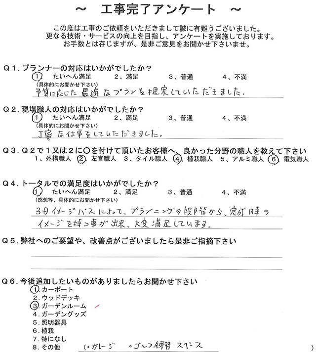 3Dイメージパースによって、プランニングの段階から、完成時のイメージを持つ事が出来、大変満足しています。 2025 8/24 2025年7月12日2025年8月24日 希望通りの完成で満足しています。また次に何かあったらお願いしたいです。 費用、詳細説明が分かりやすかった。感じが良い。施工、仕上がりも問題なし。 関連記事 仙台市 目隠しフェンス グランドアートウォール 樹ら楽ステージ プラスG 富谷市 ガーデンルーム工事 他社ともあいみつさせていただきましたが、もっともていねいにご対応いただきました。 こちらの意向をくみとったプランを提案して頂き、良かったです。ていねいでキレイな施工で満足です。 現場調査、見積や契約内容説明など、すべてにおいて誠実で丁寧な対応で、大いに好感が持てた。 こちらの要望をすぐお見積書にして頂き、図面、3D等とても分かりやすくて良かったです。 きっちりした図面とグラフィックで分かりやすかった。施工がていねいと感じた。 いろいろ親身に対応をいただいた。暑い中、一生懸命仕事していただいた。