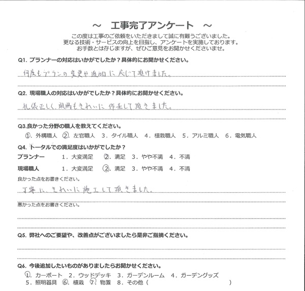 何度もプランの変更や追加に応じて頂けました。丁寧に、きれいに施工して頂きました。 2025 8/24 2025年7月12日2025年8月24日 大変親身にご対応いただき、こちらの要望を取り入れたプランを作成いただきました。又、プラスαの提案をしてくださり感謝しております。 こちらの希望を聞いて色々提案してくれたりと対応が良かった。仕事がていねいなだけでなく、対応がとても親切だった。 関連記事 仙台市 目隠しフェンス グランドアートウォール 樹ら楽ステージ プラスG 富谷市 ガーデンルーム工事 他社ともあいみつさせていただきましたが、もっともていねいにご対応いただきました。 こちらの意向をくみとったプランを提案して頂き、良かったです。ていねいでキレイな施工で満足です。 現場調査、見積や契約内容説明など、すべてにおいて誠実で丁寧な対応で、大いに好感が持てた。 こちらの要望をすぐお見積書にして頂き、図面、3D等とても分かりやすくて良かったです。 きっちりした図面とグラフィックで分かりやすかった。施工がていねいと感じた。 いろいろ親身に対応をいただいた。暑い中、一生懸命仕事していただいた。