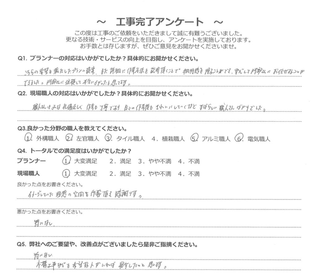 富谷市 ガーデンルーム工事 2025 10/15 2025年10月15日 こちらの要望を満たしたプランの提案、詳細に作業方法を説明いただくことで納得感を得ることができ安心して阿部さんにお任せすることができました。 他社ともあいみつさせていただきましたが、もっともていねいにご対応いただきました。 仙台市 目隠しフェンス グランドアートウォール 樹ら楽ステージ プラスG 関連記事 仙台市 目隠しフェンス グランドアートウォール 樹ら楽ステージ プラスG 他社ともあいみつさせていただきましたが、もっともていねいにご対応いただきました。 こちらの意向をくみとったプランを提案して頂き、良かったです。ていねいでキレイな施工で満足です。 現場調査、見積や契約内容説明など、すべてにおいて誠実で丁寧な対応で、大いに好感が持てた。 こちらの要望をすぐお見積書にして頂き、図面、3D等とても分かりやすくて良かったです。 きっちりした図面とグラフィックで分かりやすかった。施工がていねいと感じた。 いろいろ親身に対応をいただいた。暑い中、一生懸命仕事していただいた。 こちらの要望に沿っての提案やアドバイスがたいへんわかりやすく、納得のいくプランができあがり良かったです。