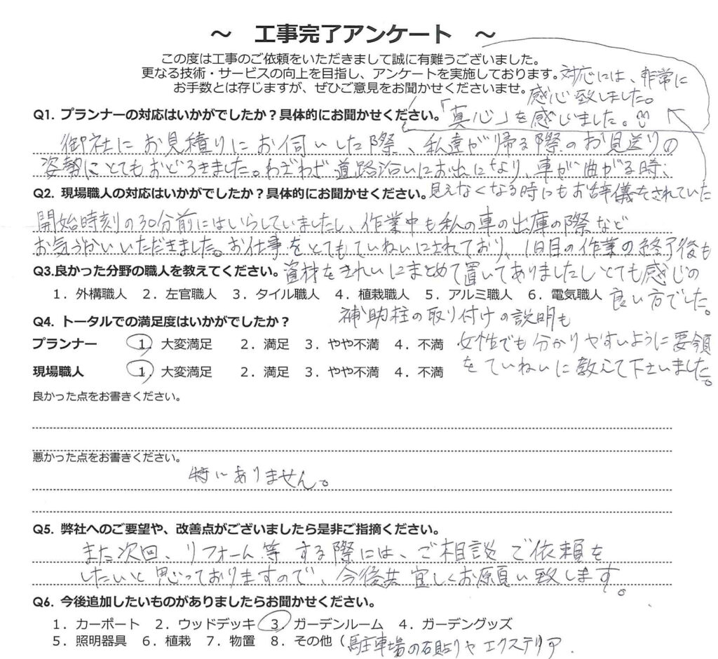 私達が帰る際のお見送りの姿勢にとてもおどろきました。「真心」を感じました。 2025 8/24 2025年7月12日2025年8月24日 一つ一つの作業がとても丁寧で、質問した事にも分かりやすく対応してもらえた。自分達がイメージした以上の出来で、とても満足しています。 仕事が丁寧でシビルさんに頼んで良かったです。知人が外構業者を探していたら真っ先に紹介したいと思います。 関連記事 仙台市 目隠しフェンス グランドアートウォール 樹ら楽ステージ プラスG 富谷市 ガーデンルーム工事 他社ともあいみつさせていただきましたが、もっともていねいにご対応いただきました。 こちらの意向をくみとったプランを提案して頂き、良かったです。ていねいでキレイな施工で満足です。 現場調査、見積や契約内容説明など、すべてにおいて誠実で丁寧な対応で、大いに好感が持てた。 こちらの要望をすぐお見積書にして頂き、図面、3D等とても分かりやすくて良かったです。 きっちりした図面とグラフィックで分かりやすかった。施工がていねいと感じた。 いろいろ親身に対応をいただいた。暑い中、一生懸命仕事していただいた。