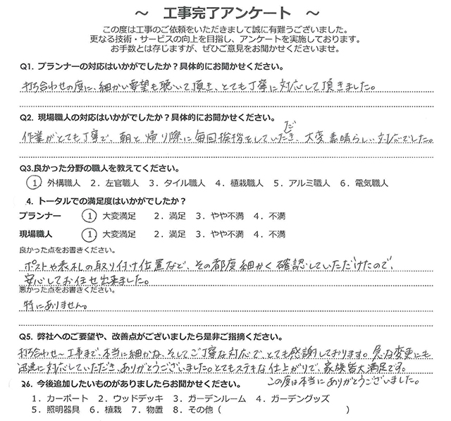 打ち合わせの度に、細かい要望も聴いて頂き、とても丁寧に対応して頂きました。 2025 8/24 2025年7月12日2025年8月24日 すべて良かったです。たいへん丁寧な仕事をしていただきました。 一つ一つの作業がとても丁寧で、質問した事にも分かりやすく対応してもらえた。自分達がイメージした以上の出来で、とても満足しています。 関連記事 仙台市 目隠しフェンス グランドアートウォール 樹ら楽ステージ プラスG 富谷市 ガーデンルーム工事 他社ともあいみつさせていただきましたが、もっともていねいにご対応いただきました。 こちらの意向をくみとったプランを提案して頂き、良かったです。ていねいでキレイな施工で満足です。 現場調査、見積や契約内容説明など、すべてにおいて誠実で丁寧な対応で、大いに好感が持てた。 こちらの要望をすぐお見積書にして頂き、図面、3D等とても分かりやすくて良かったです。 きっちりした図面とグラフィックで分かりやすかった。施工がていねいと感じた。 いろいろ親身に対応をいただいた。暑い中、一生懸命仕事していただいた。