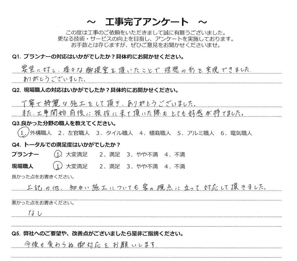仙台市 目隠しフェンス グランドアートウォール 樹ら楽ステージ プラスG 2025 10/20 2025年10月20日 要望に対して様々な御提案を頂いたことで理想の形を実現できました。ありがとうございました。 富谷市 ガーデンルーム工事 関連記事 富谷市 ガーデンルーム工事 他社ともあいみつさせていただきましたが、もっともていねいにご対応いただきました。 こちらの意向をくみとったプランを提案して頂き、良かったです。ていねいでキレイな施工で満足です。 現場調査、見積や契約内容説明など、すべてにおいて誠実で丁寧な対応で、大いに好感が持てた。 こちらの要望をすぐお見積書にして頂き、図面、3D等とても分かりやすくて良かったです。 きっちりした図面とグラフィックで分かりやすかった。施工がていねいと感じた。 いろいろ親身に対応をいただいた。暑い中、一生懸命仕事していただいた。 こちらの要望に沿っての提案やアドバイスがたいへんわかりやすく、納得のいくプランができあがり良かったです。
