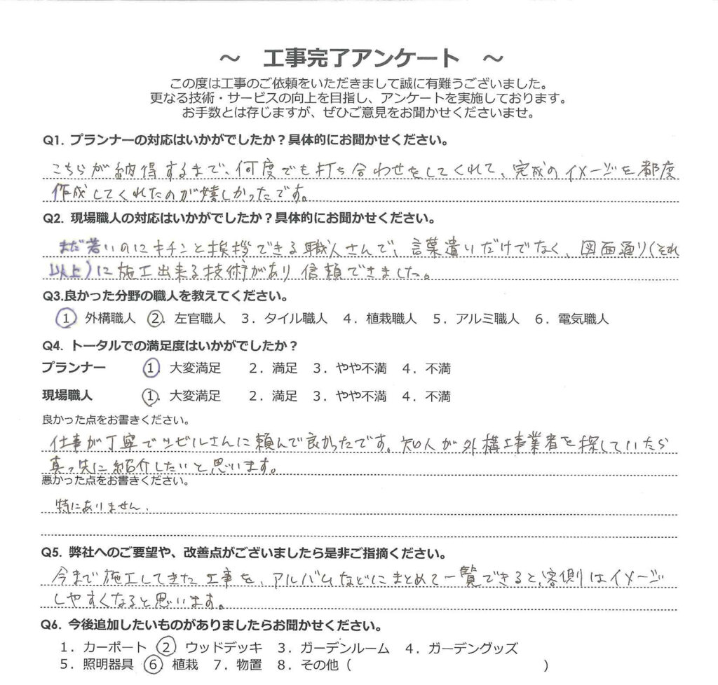 仕事が丁寧でシビルさんに頼んで良かったです。知人が外構業者を探していたら真っ先に紹介したいと思います。 2025 8/24 2025年7月12日2025年8月24日 私達が帰る際のお見送りの姿勢にとてもおどろきました。「真心」を感じました。 とても良い提案のお陰で満足のいくお庭ができました。社長さんもとてもいい方でシビルジャパンにお願いして良かったと思いました。 関連記事 仙台市 目隠しフェンス グランドアートウォール 樹ら楽ステージ プラスG 富谷市 ガーデンルーム工事 他社ともあいみつさせていただきましたが、もっともていねいにご対応いただきました。 こちらの意向をくみとったプランを提案して頂き、良かったです。ていねいでキレイな施工で満足です。 現場調査、見積や契約内容説明など、すべてにおいて誠実で丁寧な対応で、大いに好感が持てた。 こちらの要望をすぐお見積書にして頂き、図面、3D等とても分かりやすくて良かったです。 きっちりした図面とグラフィックで分かりやすかった。施工がていねいと感じた。 いろいろ親身に対応をいただいた。暑い中、一生懸命仕事していただいた。