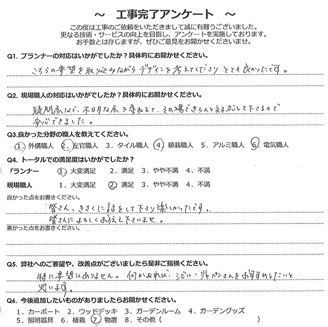 こちらの要望を取り込みながらデザインを考えてくださり、とても良かったです。皆さん、きさくに話をして下さり、楽しかったです。 2025 8/24 2025年6月13日2025年8月24日 全職人さんが頑張って下さり、大変満足しています。見積りからその他の対応も1番早くレスポンスを下さり、満足している。 関連記事 仙台市 目隠しフェンス グランドアートウォール 樹ら楽ステージ プラスG 富谷市 ガーデンルーム工事 他社ともあいみつさせていただきましたが、もっともていねいにご対応いただきました。 こちらの意向をくみとったプランを提案して頂き、良かったです。ていねいでキレイな施工で満足です。 現場調査、見積や契約内容説明など、すべてにおいて誠実で丁寧な対応で、大いに好感が持てた。 こちらの要望をすぐお見積書にして頂き、図面、3D等とても分かりやすくて良かったです。 きっちりした図面とグラフィックで分かりやすかった。施工がていねいと感じた。 いろいろ親身に対応をいただいた。暑い中、一生懸命仕事していただいた。
