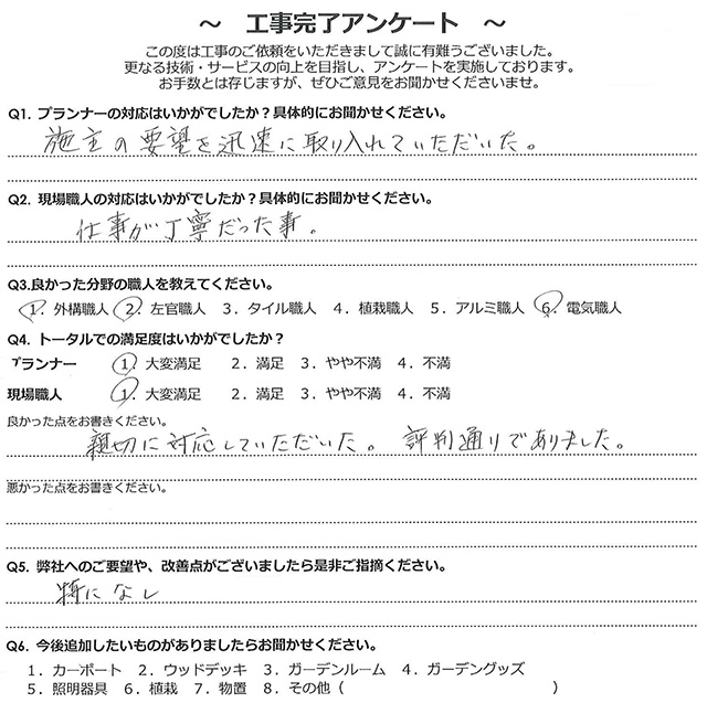 施主の要望を迅速に取り入れていただいた。親切に対応していただいた。評判通りでありました。