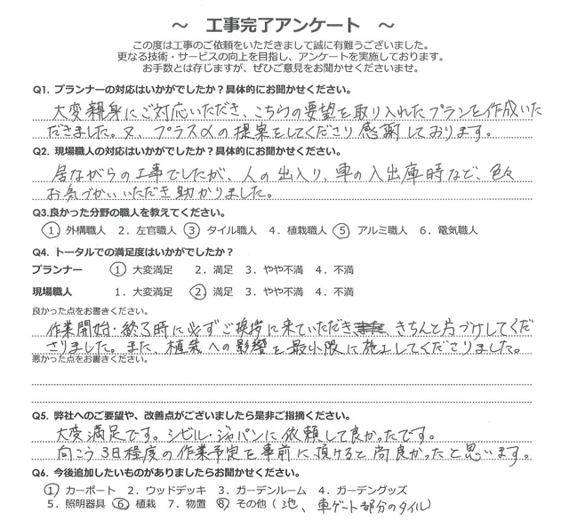 大変親身にご対応いただき、こちらの要望を取り入れたプランを作成いただきました。又、プラスαの提案をしてくださり感謝しております。 2025 8/24 2025年7月12日2025年8月24日 とても対応はいいと思いました。細かいところまで気にしてもらって、とても満足しました。 何度もプランの変更や追加に応じて頂けました。丁寧に、きれいに施工して頂きました。 関連記事 仙台市 目隠しフェンス グランドアートウォール 樹ら楽ステージ プラスG 富谷市 ガーデンルーム工事 他社ともあいみつさせていただきましたが、もっともていねいにご対応いただきました。 こちらの意向をくみとったプランを提案して頂き、良かったです。ていねいでキレイな施工で満足です。 現場調査、見積や契約内容説明など、すべてにおいて誠実で丁寧な対応で、大いに好感が持てた。 こちらの要望をすぐお見積書にして頂き、図面、3D等とても分かりやすくて良かったです。 きっちりした図面とグラフィックで分かりやすかった。施工がていねいと感じた。 いろいろ親身に対応をいただいた。暑い中、一生懸命仕事していただいた。