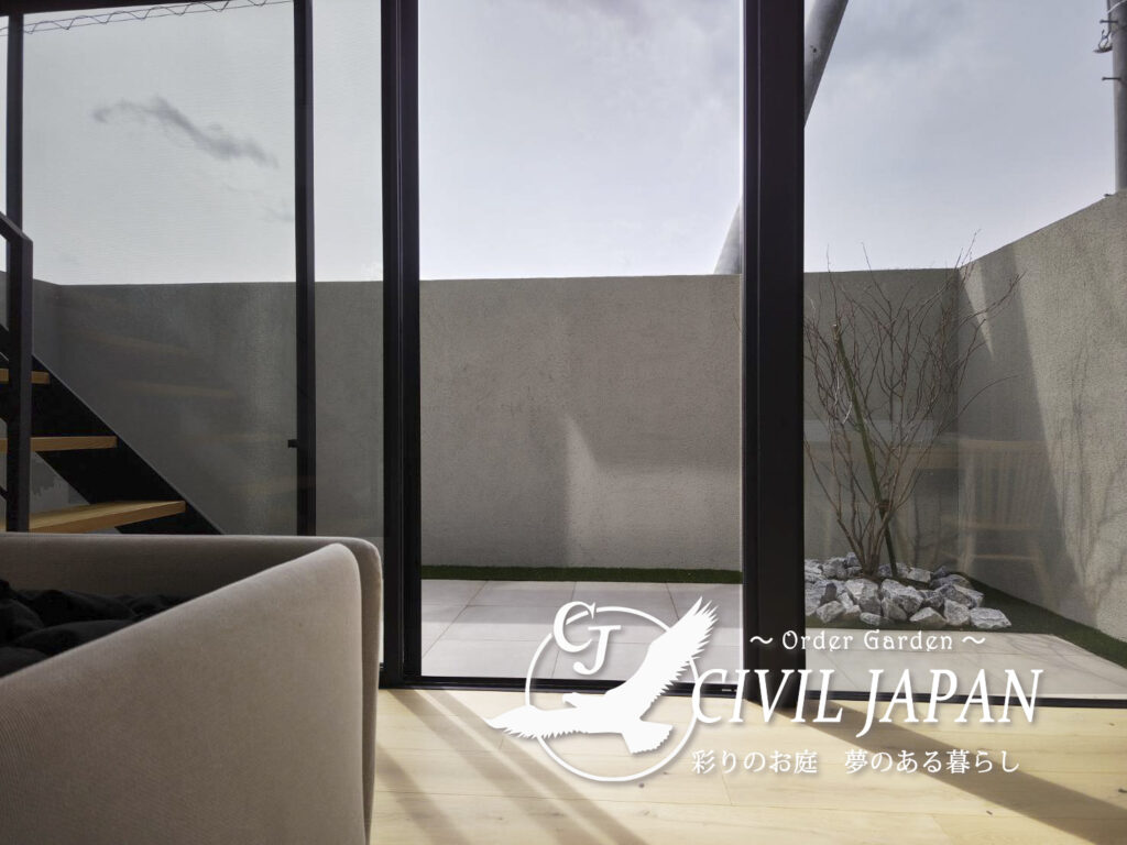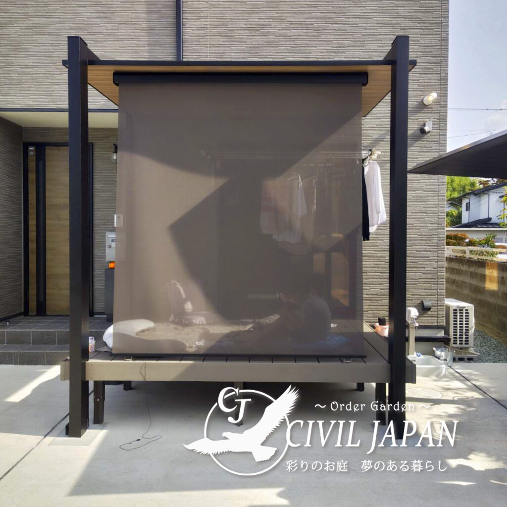 【仙台市若林区 外構施工】掃き出し窓前のタイルデッキとガーデンルームGFで快適なプライベート空間