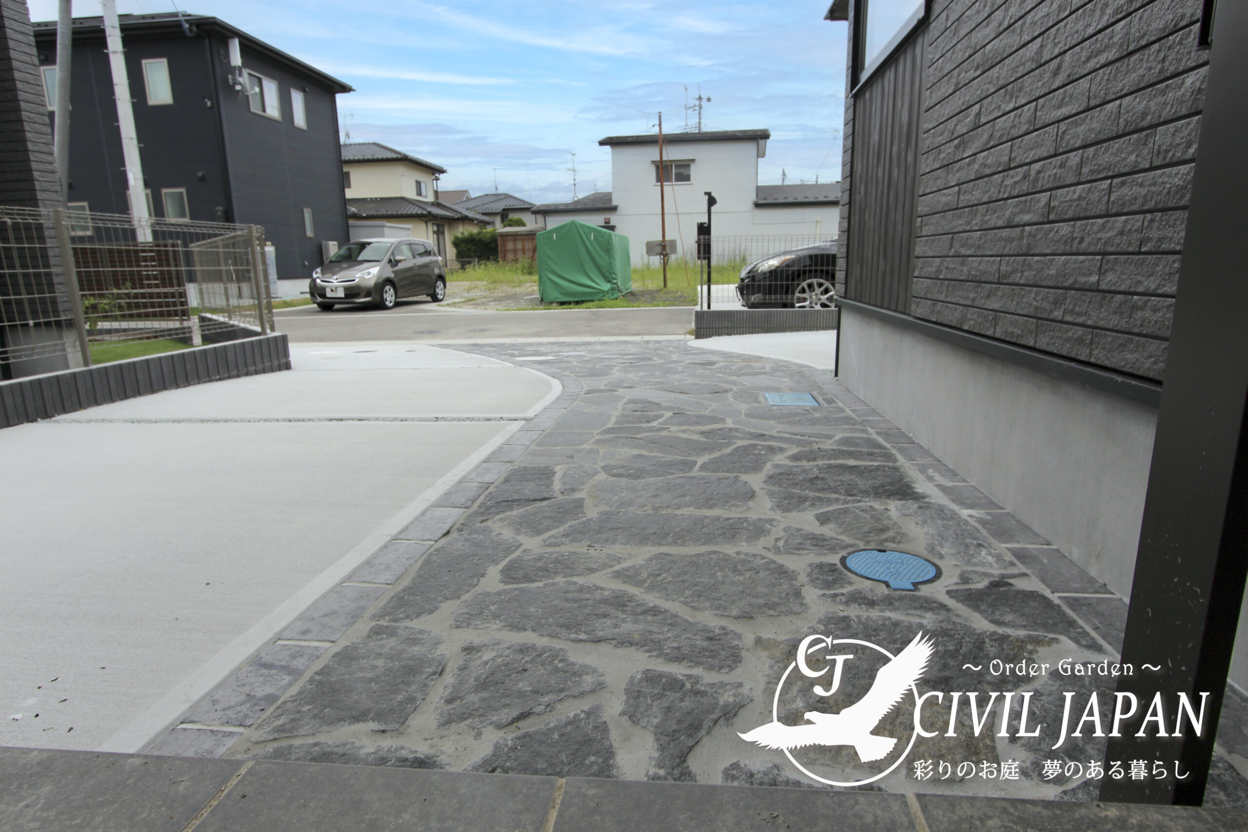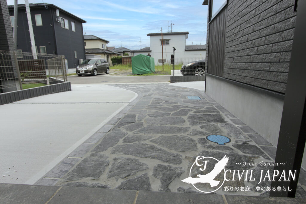 玄関までのアプローチ設計を中心に、天然石の素材感を活かしたデザインと、シンプルで使いやすいエクステリアの組み合わせで、長く快適に暮らせる外構空間が完成しました。