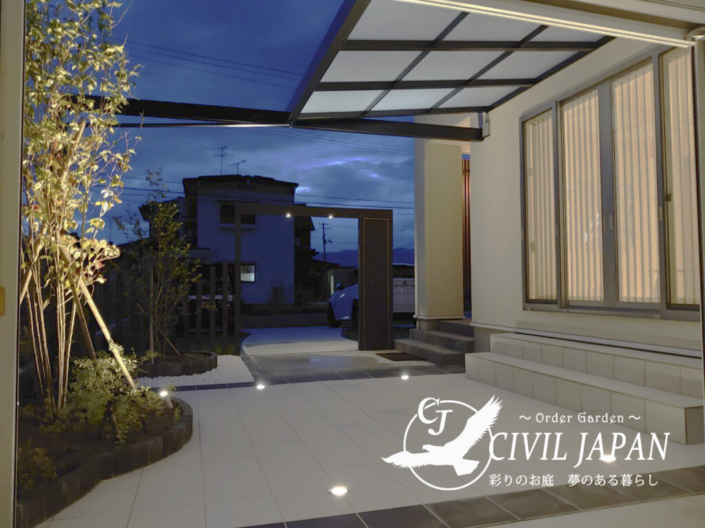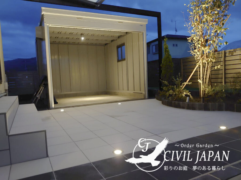 ガレージから手前まではタイルを敷いて部分的にライトを埋め込みました。
