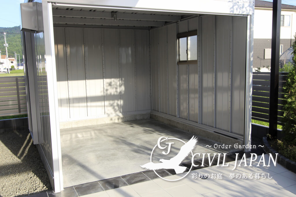 まず、庭の奥にガレージを設置しました。照明、コンセント、ガラス窓、壁面扉、換気扇付きです。
