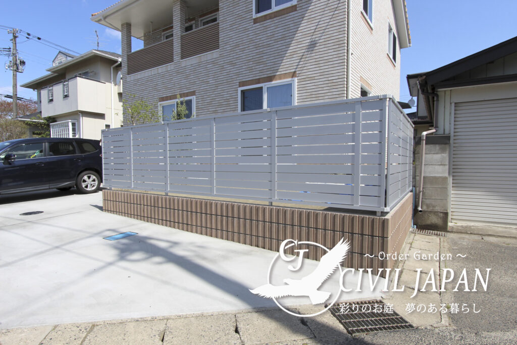 基本的にはオープン外構ですが、リビング正面の境界に設置するフェンスは横板張りのアルミフェンスです。