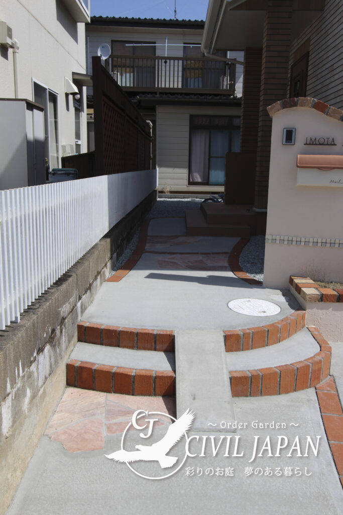 センター部分に自転車が登れるようにスロープを付けてあります。アプローチにはアクセントで天然石を使いました。
