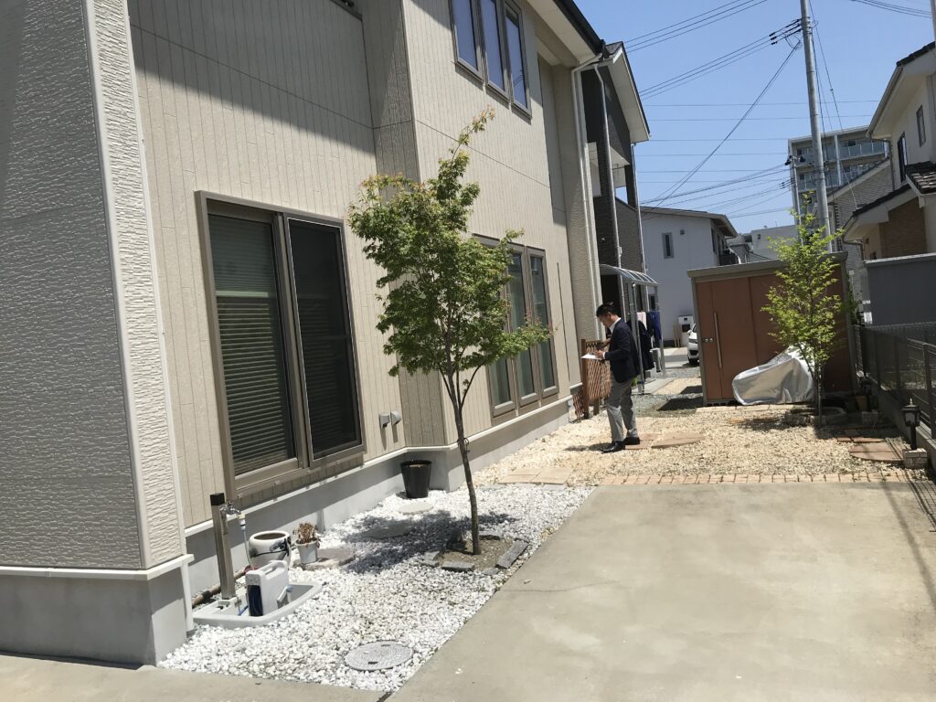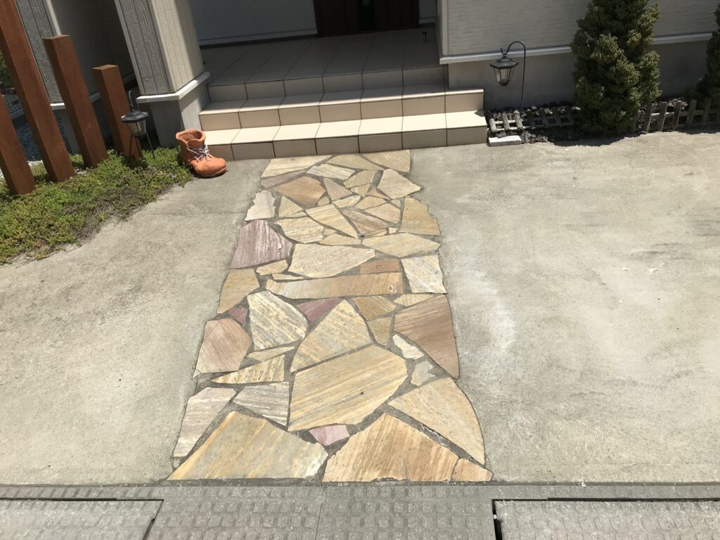 門袖の左奥に見えるのは持ち出し屋根のサイクルポートです。サイクルポートまでのアプローチは300角の平板をっ敷きました