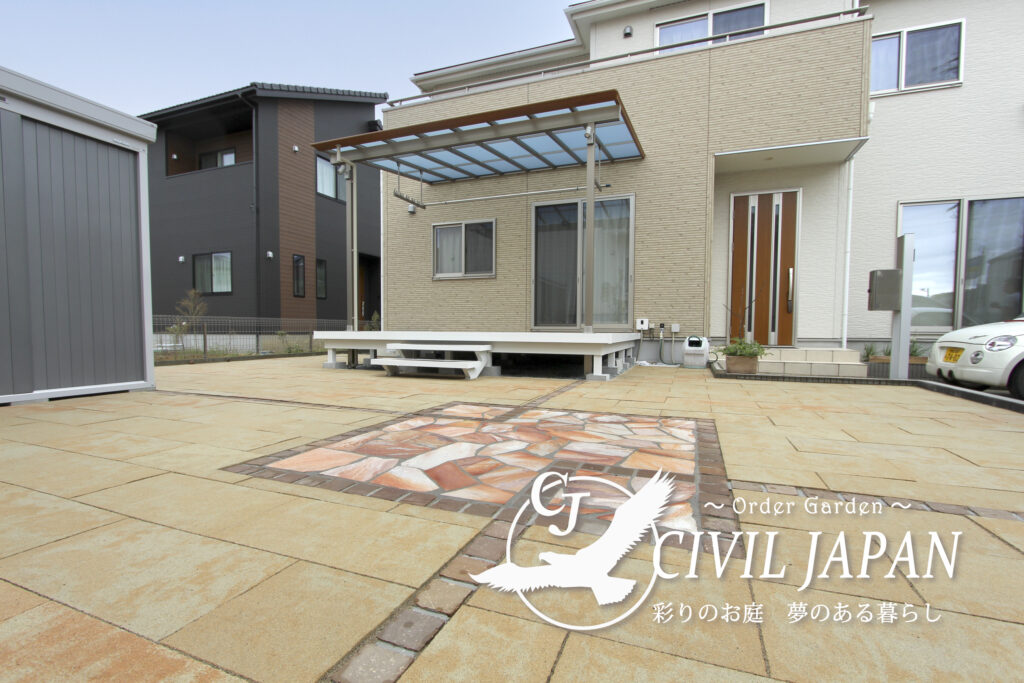 今回使用するのは東洋工業のプラーガです。プラーガは透水性なので土間のように水勾配意を考えず平らに施工することができます。そして一緒に使うのがエスビックのアースクォーツ乱形。こちらは天然石です。それでは完成写真をご覧ください。
