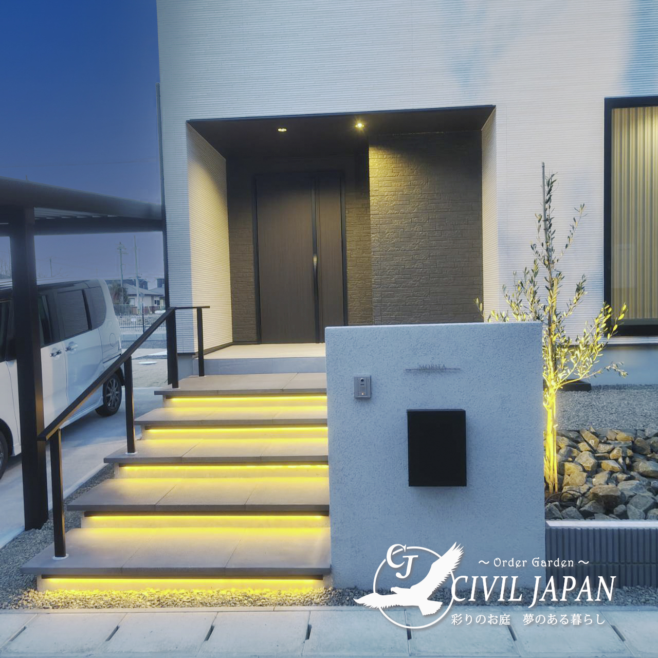 建物のデザインと調和するよう素材選びにこだわり、日中だけでなく夜間も美しく安全に使用できる外構を目指して施工いたしました。