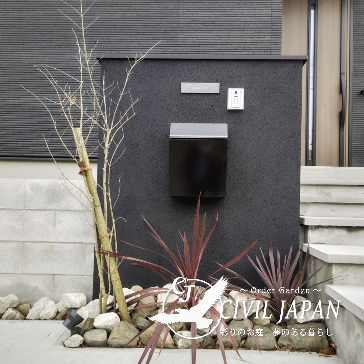 デザイン性と機能性を兼ね備えたスタイリッシュなポスト。門塀との組み合わせで一体感を演出。