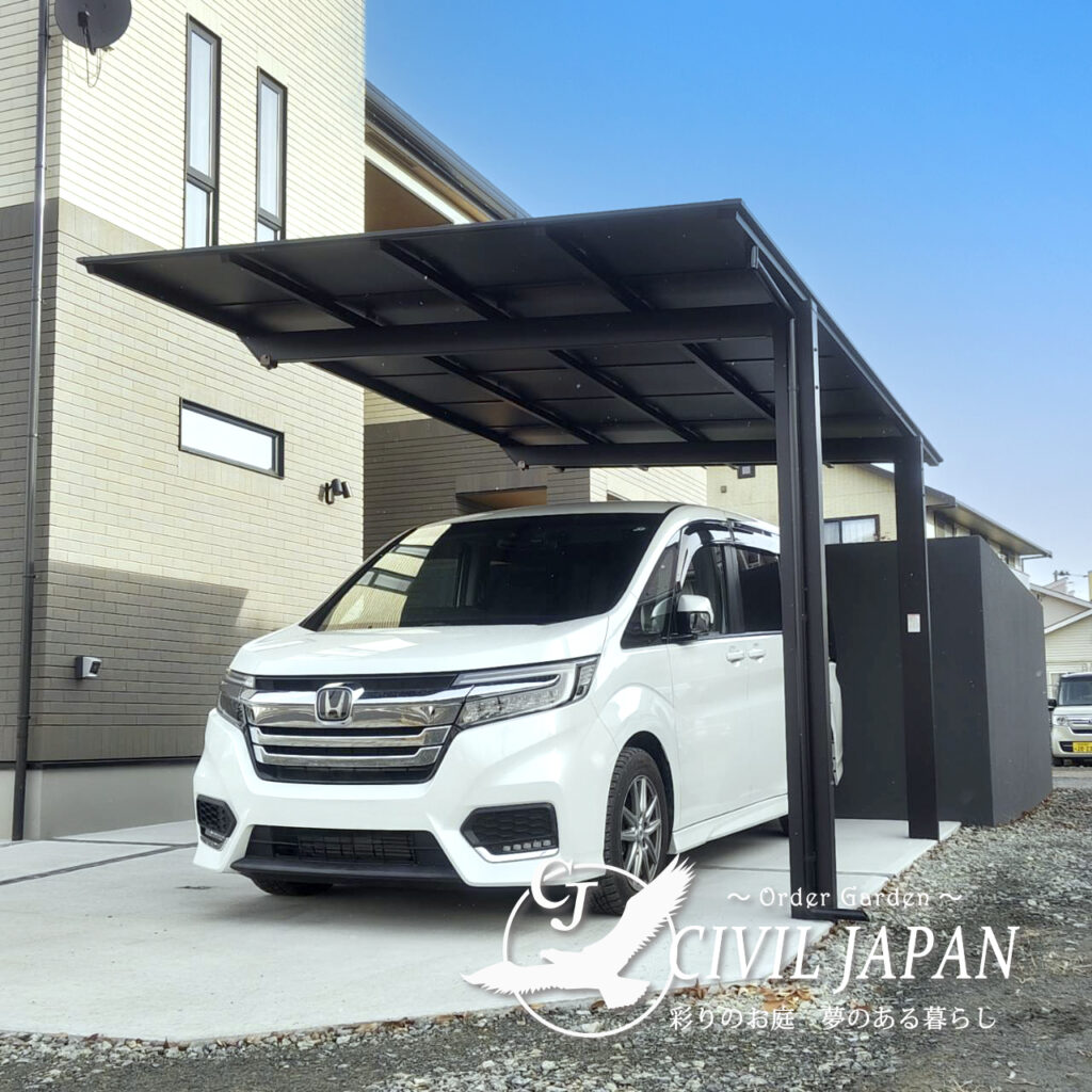 カーポートもブラック系で統一し、全体のコーディネートに一体感を持たせました。