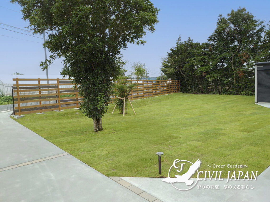 アプローチ・エントランス・駐車場をコンクリート舗装し、3台用ガレージ「ラヴィージュⅢ」とフェンスを設置。さらに200㎡に天然芝を敷き詰めることで、緑豊かな空間を演出しました。工事費用は約760万円、施工期間は2か月です。